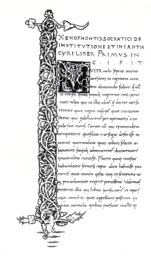 Abb. 8: Typische erste Seite eines Manuskripts des 15. Jhs. aus der Medici-Bibliothek Laurenziana (Hs. Strozzi 50). Es ist die lateinische Übersetzung von Xenophons “Kindheit des Kyros”, angefertigt von Poggio Bracciolini. Die folgenden 190 Seiten sind reine Textseiten.