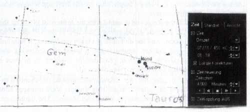 Die Programme sind nicht geeignet, die Berechnungen von Meeus (d.h. die Jupiterverfinsterung) exakt nachzustellen. Die Programme sind aber mehr als ausreichend, die Stellung von Mond und Jupiter in der jeweiligen Konstellation darzustellen. Die folgenden Bilder habe ich mit RedShift 4™ erstellt. Der Einfachheit halber und in Unkenntnis tatsächlicher Beobachtungsorte (Durham? Jarrow? Chiaves?) habe ich Durham (1,6W/54,8N) in England als fiktiven Beobachtungsort angenommen.